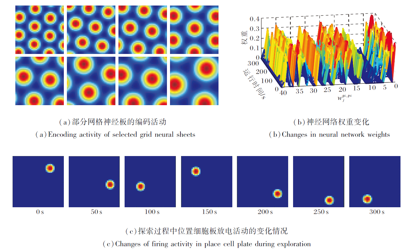 基于网格细胞编码的位置细胞放电效果如图6所示.由图可看出, 在智能体探索过程中, 网格神经板能模拟多尺度网格细胞群的周期性放电.同时, 网格神经板到位置细胞板的神经网络权值