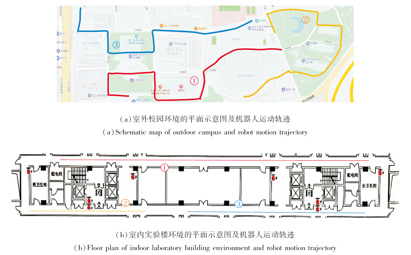 为了进一步突出EHPI的性能优势, 分别设计室内外真实环境下的机器人平台路径积分实验.室外实验在校园中进行, 室内实验在实验楼走廊中进行, 每组实验分别执行3次不同的路径积分任务.室内外环境的平面示意图及机器人执行路径积分任务的运动轨迹如图12所示.