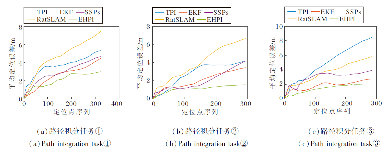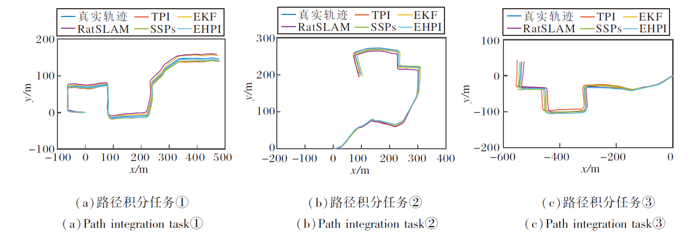 将EHPI与EKF(Extended Kalman Filter)[17]、RatSLAM[32]、基于SSPs的递归神经网络(后文简记为SSPs)[33]进行对比, 同时也与直接对角速度和线速度进行积分运算以获取当前位置的模型(后文简记为TPI)进行对比.