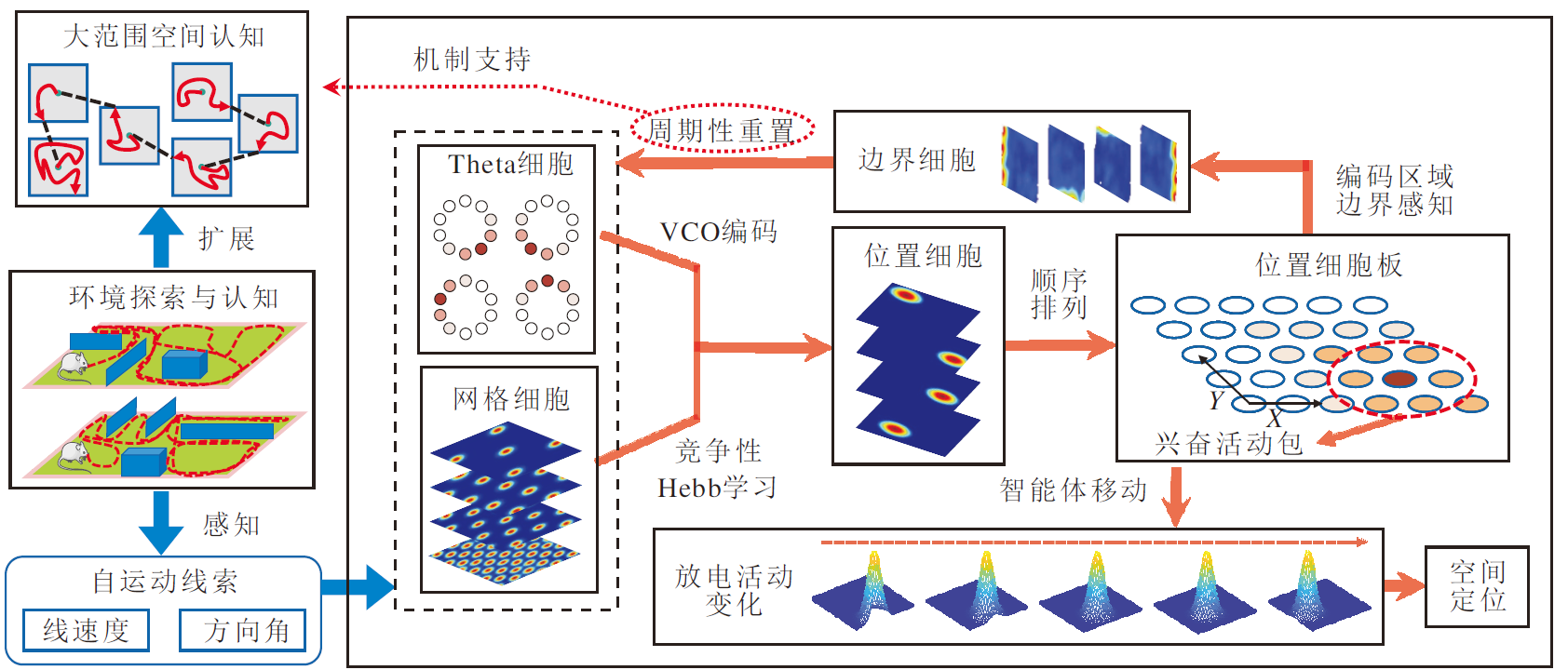 然而, 位置细胞同样接受来自非网格细胞结构的信息投射[28], 如边界细胞和Theta细胞.边界细胞主要为位置细胞提供边界信息, 并不参与路径积分的计算过程.Theta细胞以自运动线索为输入, 产生VCO(Velocity-Controlled Oscillator)信号编码特定的相位关系, 形成具有单峰放电活动的位置细胞, 从而表征空间位置[29].