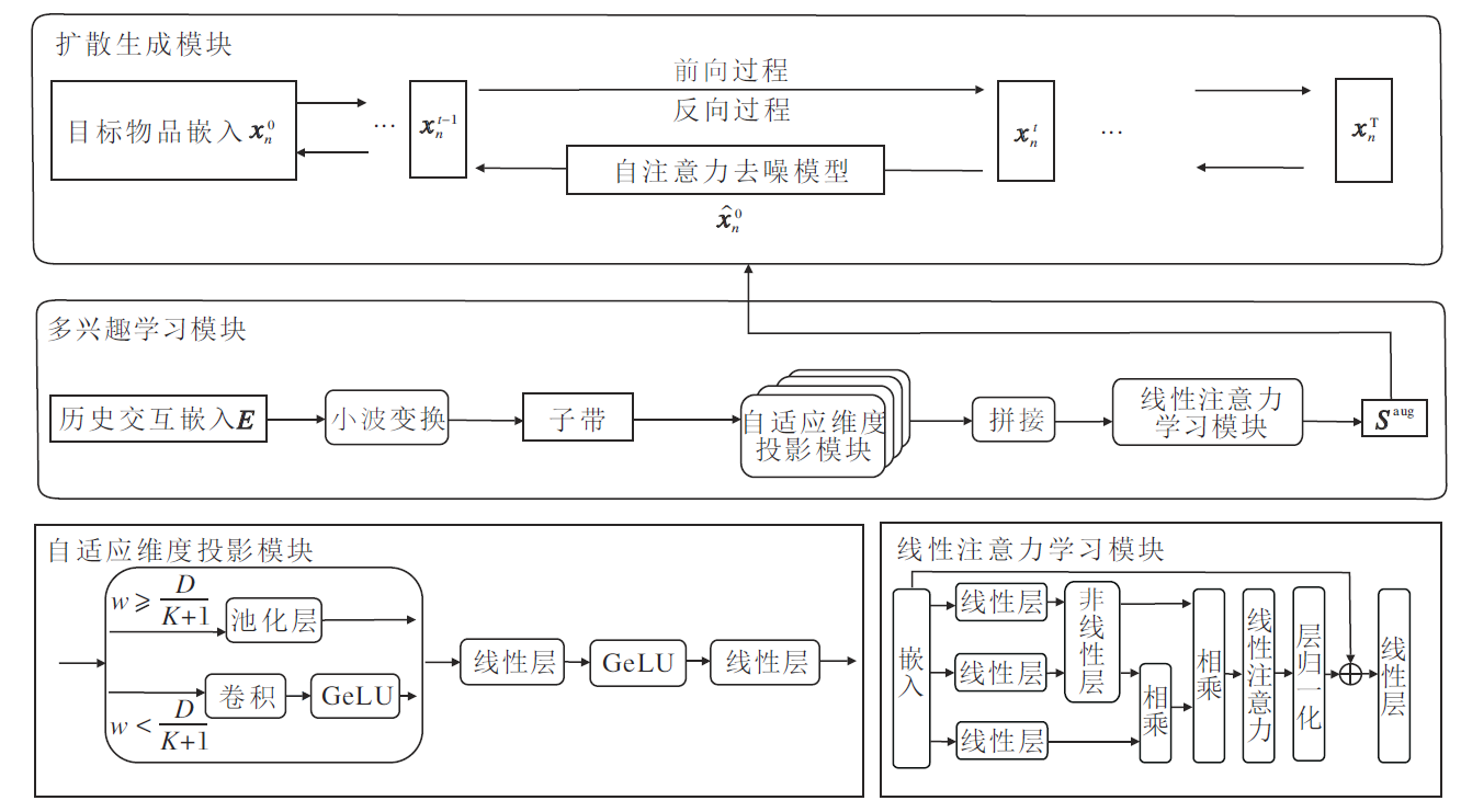 1)多兴趣学习模块.由多频段划分模块、自适应维度投影模块和线性注意力学习模块构成.首先, 原始用户交互嵌入经过基于Haar小波的多频段划分模块处理后, 将用户交互的原始分布按不同频率分解为不同维度的子带表示, 在多个尺度上分离用户兴趣的高低频细节.然后, 自适应维度投影模块动态建立跨频段的非线性映射关系, 将不同维度的频率子带重新整合为统一维度的兴趣嵌入, 以适应模型后续处理的要求.最后, 引入线性注意力学习模块, 从重构后的兴趣分布中高效提取、聚合依赖关系, 形成用于引导扩散过程的用户多粒度兴趣表征.小波变换的多尺度分解特性使模型能分别关注短期动态偏好与长期稳定兴趣, 避免直接从原始稠密的用户交互序列中提取特征时引入噪声和虚假关联.