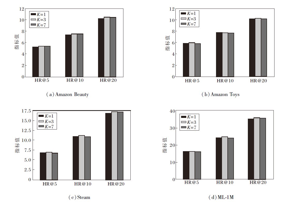 小波变换通过迭代分解原始数据, 逐层提取高频细节信息和低频全局特征.理论上, 增加小波变换划分次数K可获取更多的细节信息, 提升模型对用户多兴趣信号的学习能力, 但也会增加模型的复杂度和训练时间.合适的参数选择有助于提高模型的泛化能力.