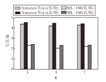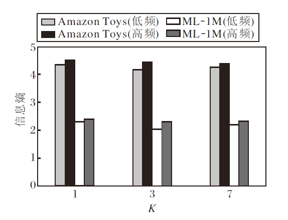 为了探究K对序列信息结构的作用, 在Amazon Toys、ML-1M这两种规模数据集上, 统计不同K值下高频子带与低频子带的平均信息熵对比, 结果如图3所示.