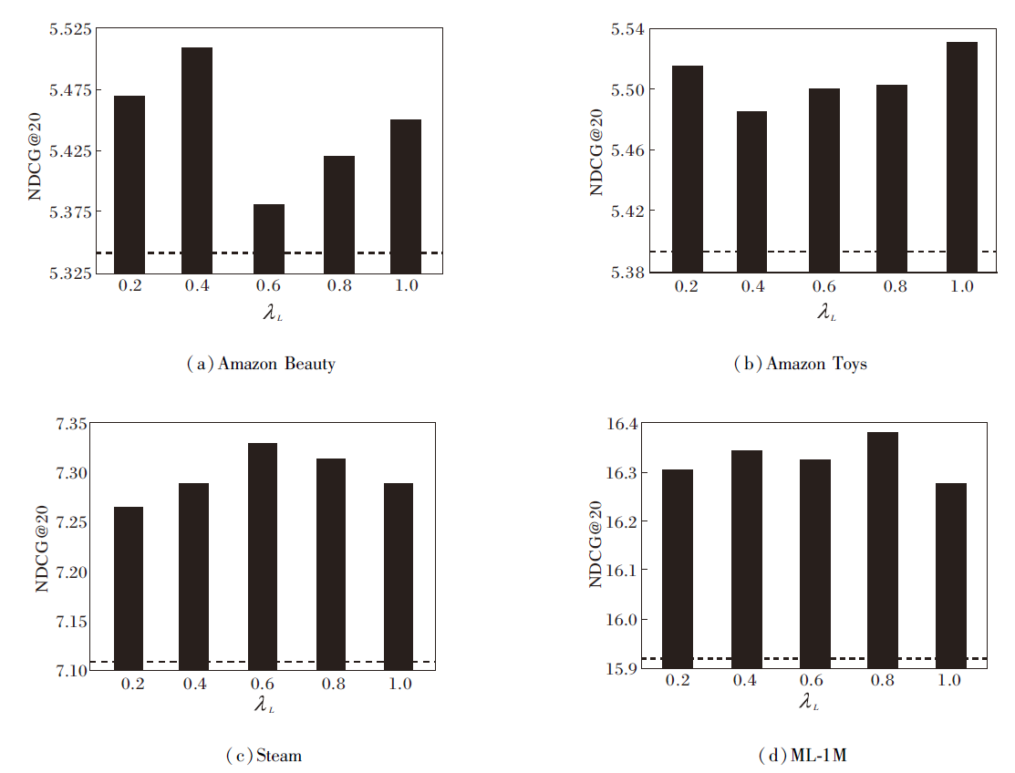 多兴趣学习模块通过扩散指导比率λ L实现学习嵌入与历史交互嵌入的融合, 改变λ L能有效调控模型的特征表达能力.为了探究λ L对WEG4Rec性能的影响, 在4个数据集上, 以NDCG@20为评估指标, 探究λ L=0.2, 0.4, 0.6, 0.8, 1.0时的WEG4Rec性能变化, 结果如图4所示, 图中虚线表示移除多兴趣学习模块和多任务学习模块后WEG4Rec的NDCG@20指标值.