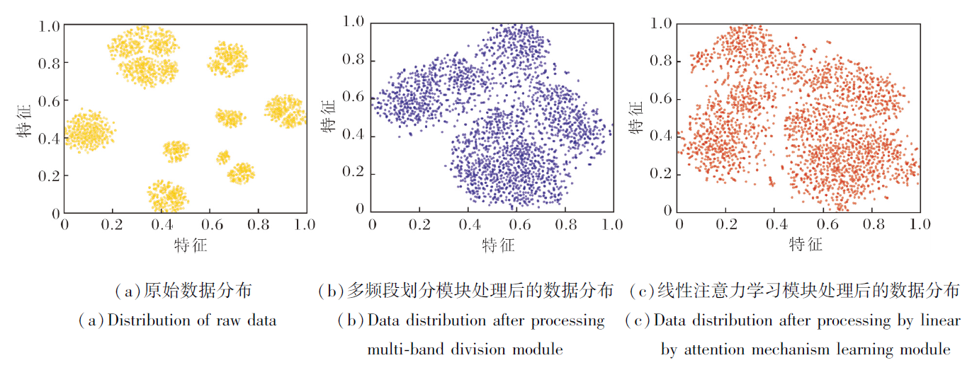 观察t-SNE图像可发现, 原始数据本身具备一定的聚类结构, 通过多频段划分模块处理之后数据变得更分散, 这反映小波变换将序列信息分解到不同频率子带, 增强特征的多样性或区分度.最后在经过注意力机制处理后, 特征重新聚集, 形成新的、与经过小波变换处理后的特征分布相适应的聚类趋势.