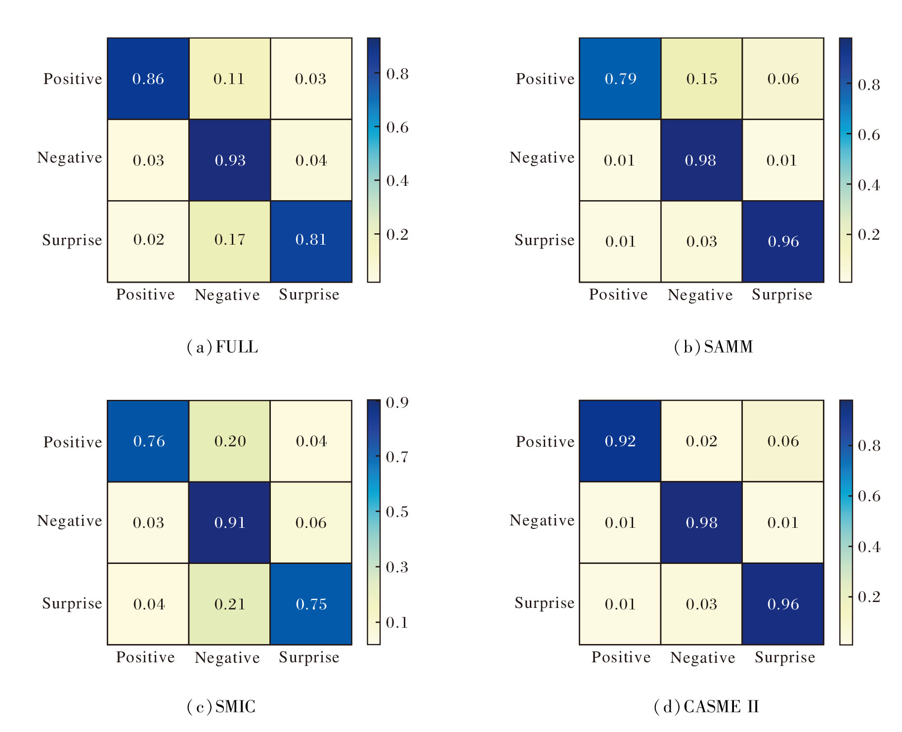 为了进一步分析HT-SGCA的性能, 在FULL、SMIC、SAMM、CASME II数据集上给出三分类混淆矩阵, 具体如图4所示.由图可见, 在FULL数据集上, HT-SGCA对Negative、Positive、Surprise类别的识别准确率分别达到 0.93、0.86 和 0.81.在Negative类别上的高准确率主要归因于这类数据在3个数据集上的训练样本较充足.然而, 在SMIC、SAMM数据集上, Negative与Surprise类别之间的区分仍存在一定挑战.这可能是由于这两个数据集上训练样本相对较少, 从而增加两类情绪混淆的可能性.在 CASME II 数据集上, Negative、Positive、Surprise类别的识别准确率均超过90%, 误分类率较低, 这进一步验证HT-SGCA在该数据集上的有效性.