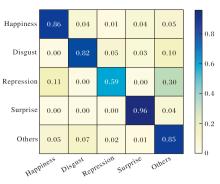 同样在CASME II数据集上进行五分类实验, 结果如图5所示.由图可见, Happiness、Surprise类别的识别准确率较高, 分别达到86%和96%, 这表明本文的双域特征关联模块能有效捕捉面部的细粒度特征.然而, 实验中Repression类别样本较容易被误分类为Happiness类别, 这一现象主要归因于两者在面部运动单元上的高度相似性.