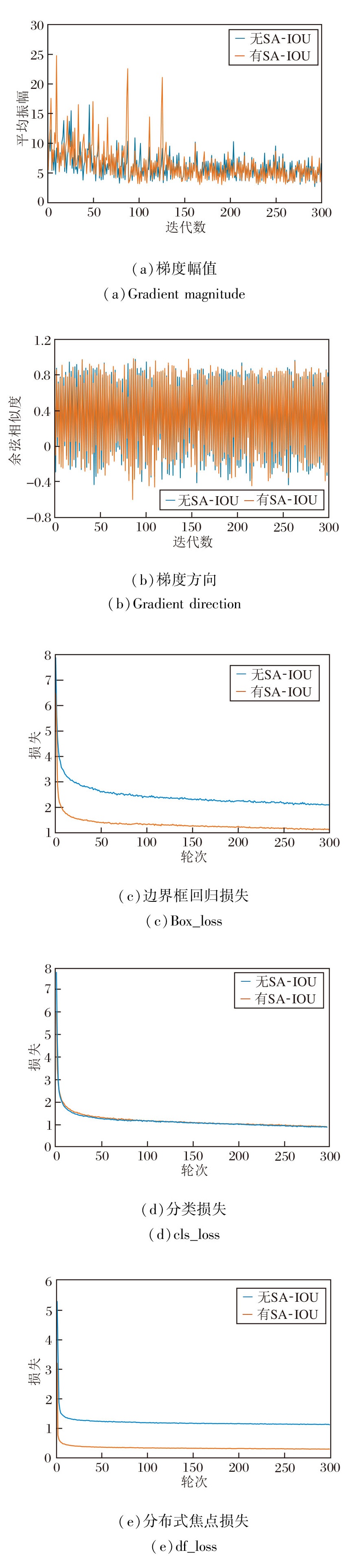 为了更清晰地观察SA-IoU梯度动态调节的效果及收敛性, 训练过程中是否加入SA-IoU后的梯度幅值、梯度方向及训练阶段损失函数结果如图8所示.
