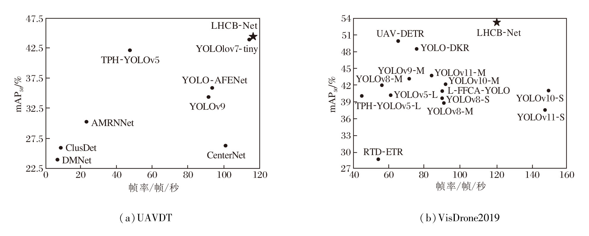 在UAVDT、VisDrone2019数据集上, 给出各模型的速度-精度权衡图, 具体如图9所示.由图可见, 无论是在UAVDT数据集上还是在VisDrone2019数据集上, LHCB-Net均实现速度与精度之间的更优 平衡.在UAVDT数据集上, LHCB-Net的权衡效果略优于YOLOv7-tiny; 在VisDrone2019数据集上, LHCB-Net虽帧率略低于YOLOv10-S和YOLOv11-S, 但精度优势明显, 整体上优于对比模型.