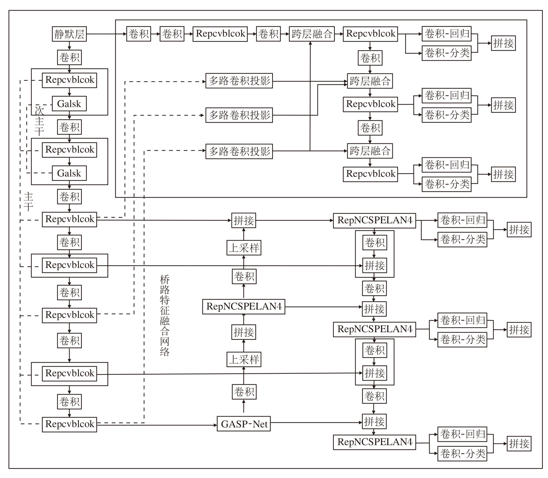 LHCB-Net重构YOLOv9主干中感受野受限、路径同质堆叠的RepNCSPELAN4, 实现解耦与轻量化, 使用Repvcblock主干与Galsk次主干实现异构协同、信息互补融合.这种解耦与协同, 使网络在同等计算下, 能更全面、自适应地处理视觉信息, 尤其在处理尺度变化、复杂背景和小目标等场景时优势显著.Repvcblock专注高效提取局部空间特征.Galsk凭借自适应大感受野、空间注意力机制和全局上下文机制三大优势专注捕获多尺度空间上下文信息和建立全局依赖关系.在颈部SPPE-LAN[19]中嵌入Galsk, 构成新的颈部网络GASP-Net(Global Atten-tion Large Selective Kernel Spatial Pooling Ensemble for Light-Weight Networks), 进一步缓解信息瓶颈问题, 提升训练的稳定性和检测精度.