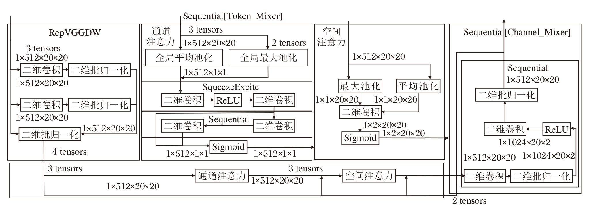 Repvcblock结构如图2所示.Repvcblock通过深度可分离卷积和残差连接, 以极低的计算成本维护高分辨率空间信息并细化局部表征.首先采用深度可分离卷积RepVGGDW(Reparameterizable VGG Depthwise Convolution)作为Token_Mixer, 用于捕获局部空间信息.设计基于通道、空间和全局上下文三个功能维度的注意力机制, 其中全局上下文维度通过非局部注意力操作捕获图像中的长程依赖关系, 专门用于解决无人机航拍中目标与环境语义关联问题.优于RepNCSPELAN4中Token_Mixer (空间操作)和Channel_Mixer (通道操作) 的分离构建的显式解耦, 比RepNCSPELAN4的混合计算更高效、专注.