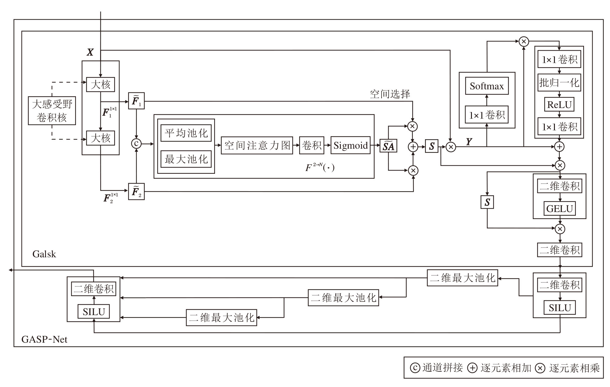 Galsk重构LSKNet[18], 增强局部细节与全局上下文建模能力, 专注于捕获多尺度空间上下文和建立全局依赖关系.采用不同尺寸的卷积核实现逐像素注意力调制与加权融合.全局上下文提供全局通道注意力, 将整个特征图的全局信息作为权重校准Galsk输出, 实现局部-区域-全局的全方位上下文感知.前馈网络利用投影层和GELU激活函数实现非线性转换, 输出判别力更强的空间加权特征.Galsk和GASP-Net结构如图3所示.