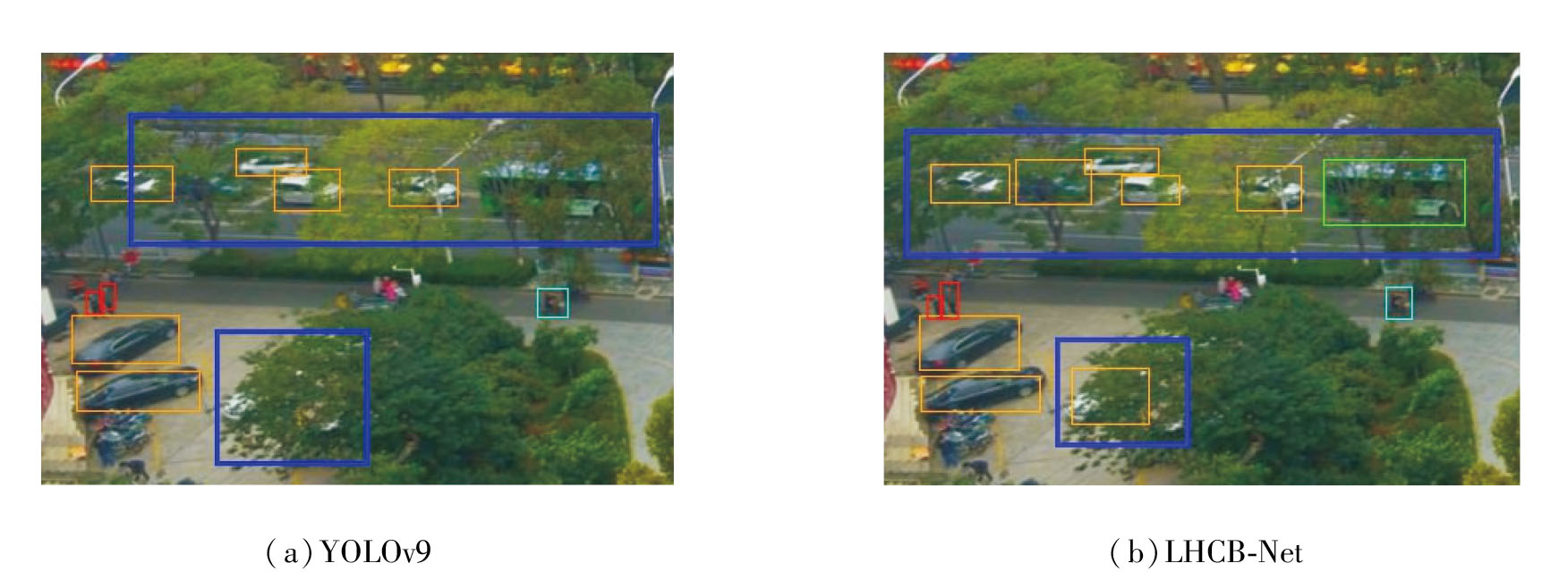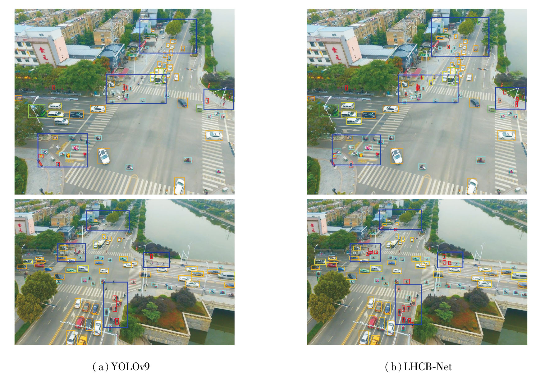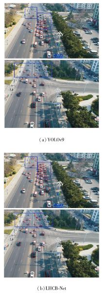 为了验证LHCB-Net在复杂场景下的适应性, 在VisDrone2019数据集上选择有严重遮挡的目标图像, YOLOv9和LHCB-Net的检测结果如图5所示, 图中蓝框标注显著区分区域.由图可见, 在复杂遮挡条件下, LHCB-Net检测稳定性和模型鲁棒性更优.