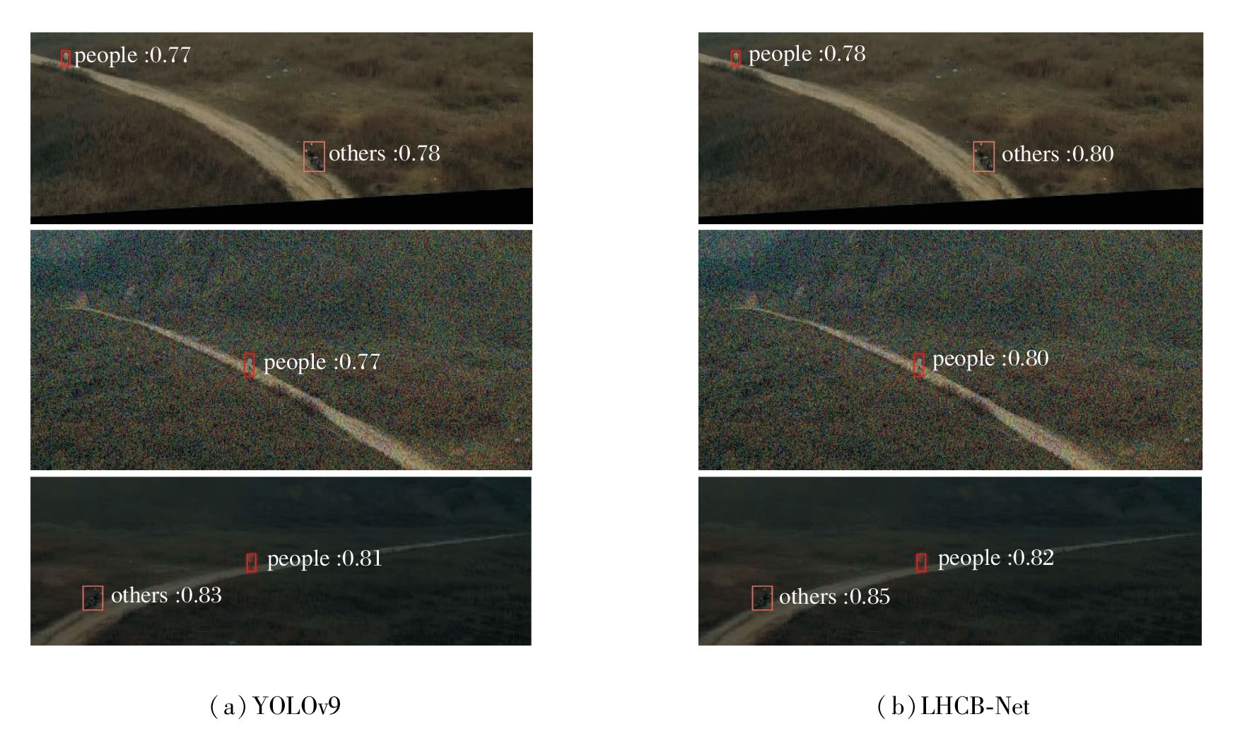 YOLOv9和LHCB-Net在相应场景中的检测结果如图7所示, 图中上下两幅图像为同一检测器上不同图像.