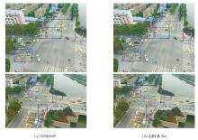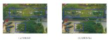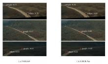 在UAVDT数据集上对比YOLOv9与LHCB-Net的检测结果, 具体如图6所示.在图中, 上下两幅图像为同一检测器上不同图像, 蓝框标记显著区分区域.