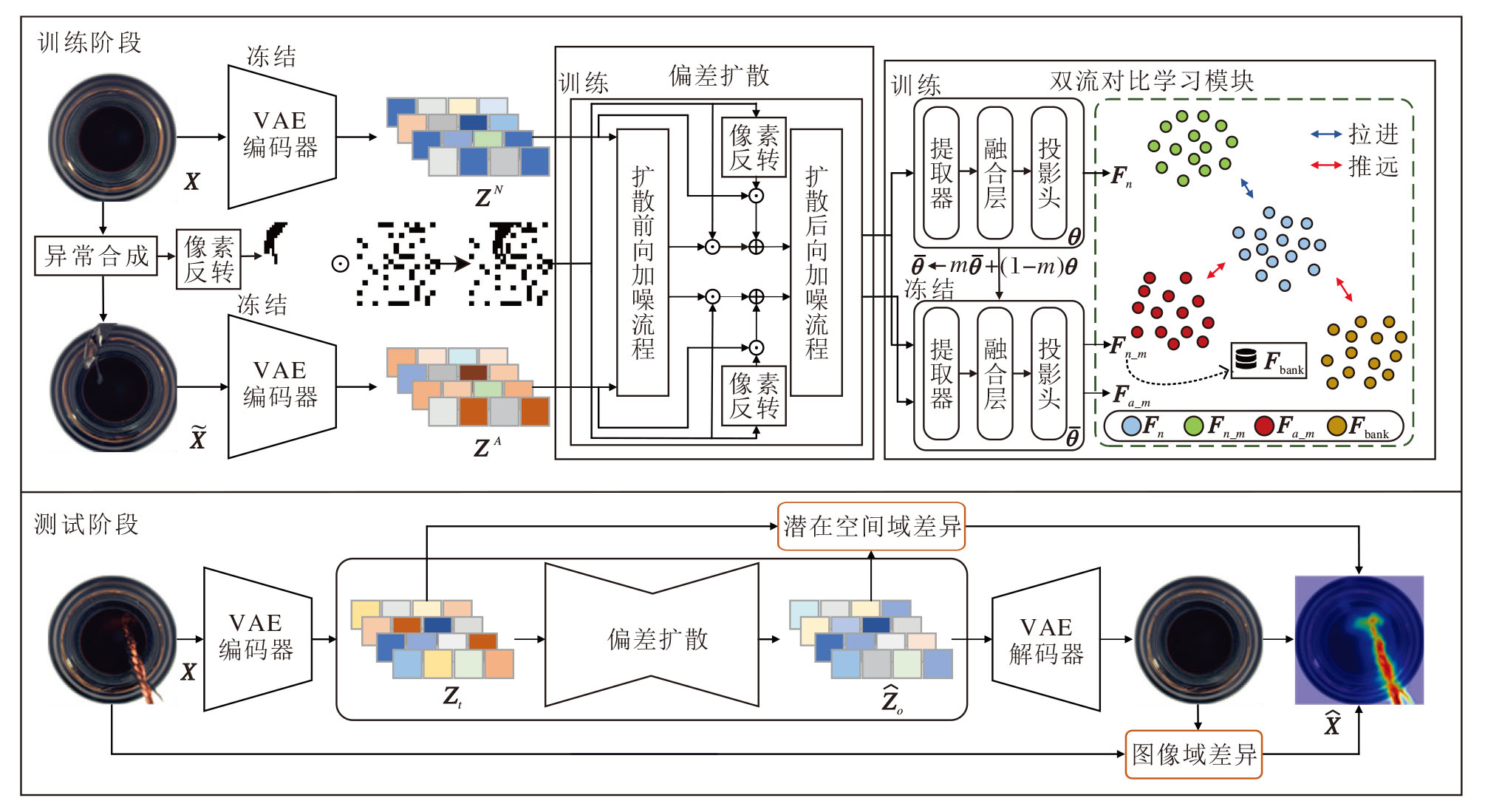 首先, 利用前景感知的异常合成策略在训练阶段为正常样本生成配对的异常样本及其掩码.然后, 将正常样本和异常样本均经VAE(Variational Auto-encoder)编码至潜在空间(指原始图像经编码器映射后的特征表征空间, 又称潜在空间域, 与原始图像所在的图像域对应), 异常掩码会与随机掩码相乘取并集, 得到含异常区域掩码的随机掩码, 偏差扩散模型会显式地对该掩码所在区域进行加噪.偏差扩散模型采用UNet(U-Shaped Network)作为重建主干, 并嵌入类别条件以指导重建过程, 使方法能根据类别条件重建特定类别的图像.在此基础上, 设计双流对比学习模块, 以“ 正常流-合成异常流” 的类内正样本间的对齐和正负样本间的分离为目标, 约束潜在空间的特征与重建轨迹, 在同一结构下对多类别正常分布进行区分式建模.在推理阶段, 基于潜在空间域尺度与图像域尺度构建差异图并融合, 得到鲁棒的像素级异常热力图.