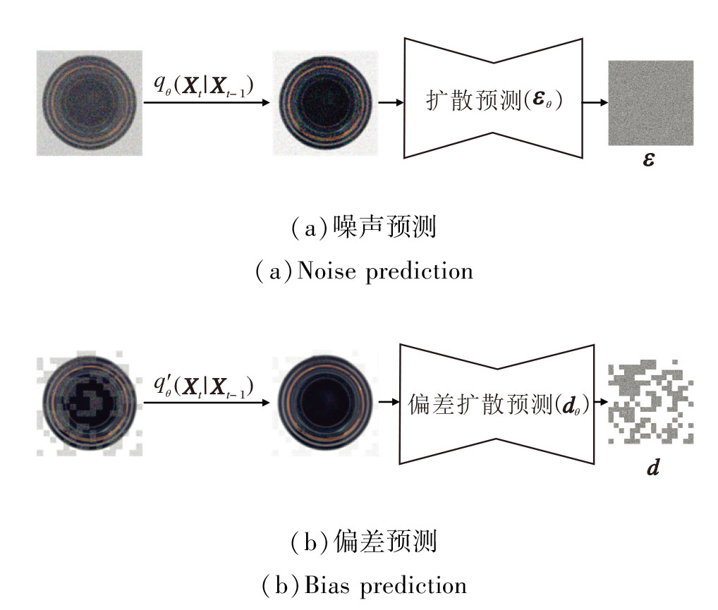 在扩散模型中, 标准扩散以去噪为学习目标, 并在推理阶段使用扩散的逆向过程将噪声图像恢复到真实图像, 但在异常检测中, 单纯去噪往往导致正常区域的信息退化或丢失.DDIM[26]的核心思想是选择性地对图像的部分区域进行加噪, 显式地将图像分为正常块和噪声块, 并在训练阶段引入逆向过程, 通过逆向过程学习从带噪状态Xt指向正常分布X0的偏差方向d, 以校正的方式复原异常成分, 并在校正后显著保持正常成分.在这一过程中, 逆向过程不仅用于去噪和恢复图像, 更关键的是作为一种学习机制, 引导方法理解异常区域与正常区域在潜在空间上的差异.噪声预测和偏差预测过程如图2所示.