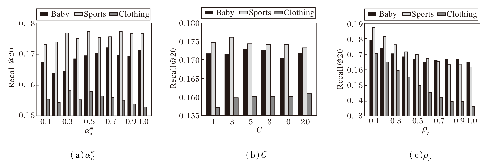 定义C=1, 3, 5, 8, 10, 20, 其对USERec性能的影响如图3(b)所示, Baby、Sports、Clothing数据集上的最佳样本数量分别为5、3、20, 可发现每批次采样3~5个样本即可获得较明显的收益, 因此综合考虑性能和计算效率, 本文实验中对于Baby、Sports、Clothing数据集的采样数量分别设定为5, 3, 5.