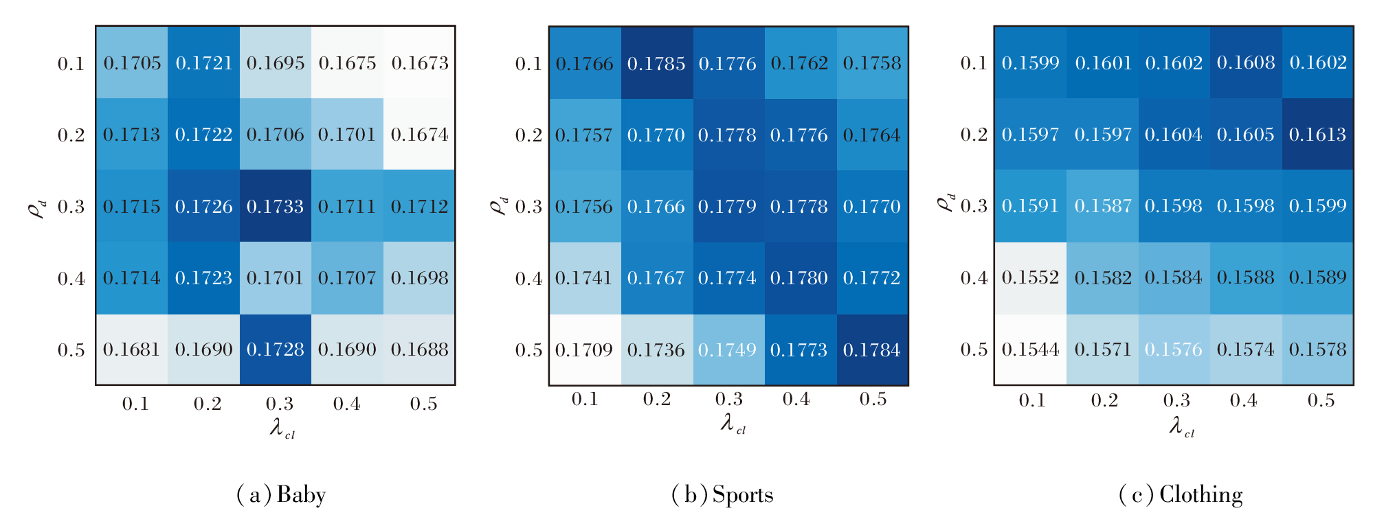 由图可见, 最优的超参数设定依据不同的数据集规模而改变.当ρ d=λcl=0.3时, USERec在Baby数据集上达到最优性能, 当ρ d=0.1, λcl=0.2时, USERec在Sports数据集上达到最优性能, 当ρ d=0.2, λcl=0.5时, USERec在Clothing数据集上达到最优性能.