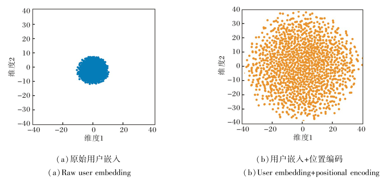 由图5可观察到, 未引入位置编码的用户嵌入高度集中在原点附近, 整体分布呈现强烈的同质化特征, 难以体现用户间的差异.在引入位置编码后, 用户嵌入的分布显著扩展并覆盖更大范围, 显示出更强的分散性和可区分性.这一现象表明, 位置编码虽然与推荐任务的语义无直接关联, 但它在初始化阶段强制拉开用户表示之间的差距, 有效缓解由随机初始化带来的表示塌缩问题, 有助于后续的用户建模.