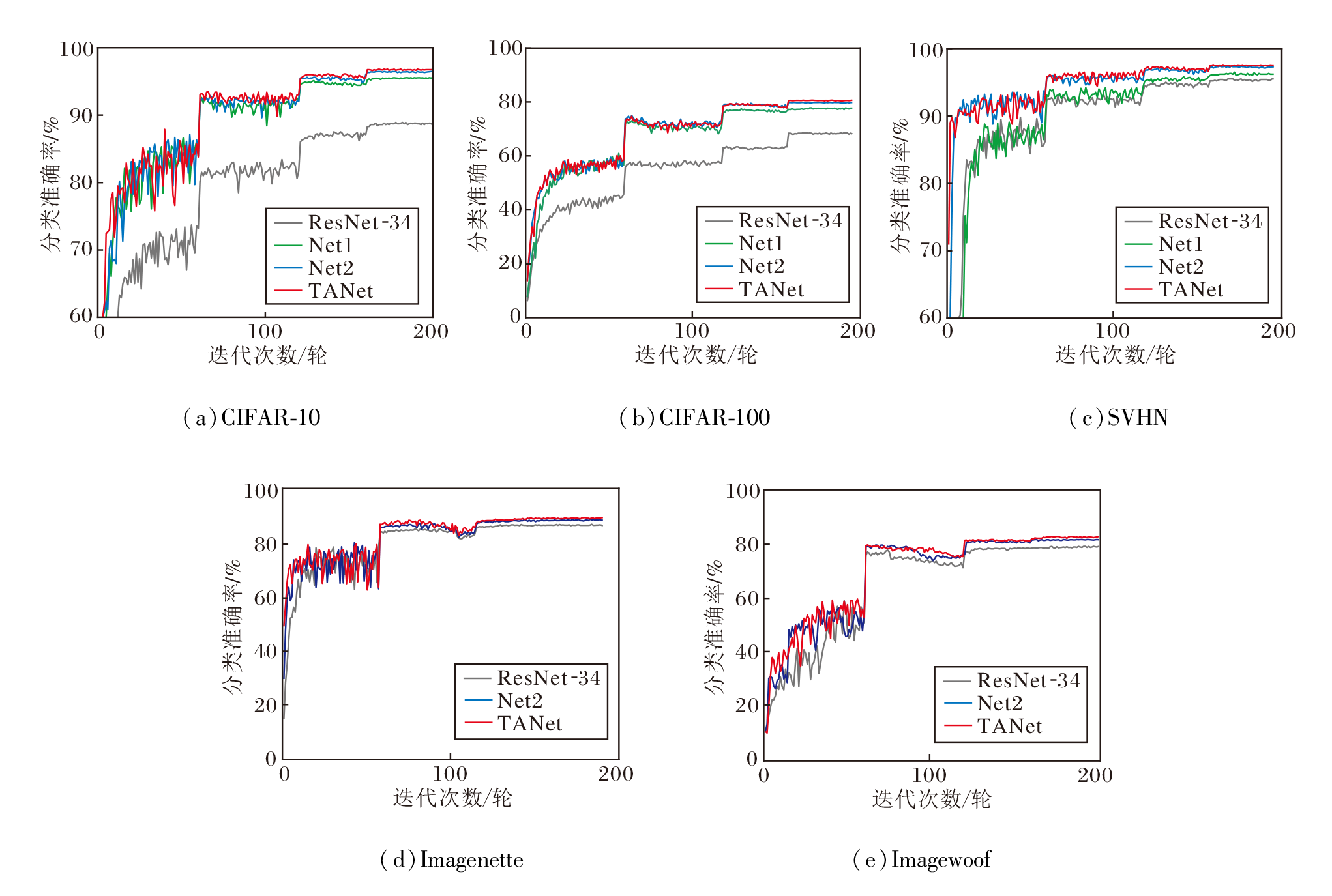 设计如下网络:1)ResNet-34.2)Net1.ResNet-34在CIFAR-100、CIFAR-10、SVHN数据集上处理图像时浅层提取阶段的首层卷积核大小改为3× 3, 同时去除最大池化操作, 在Imagenette、Imagewoof数据集上不变.3)Net2.在Net1基础上将所有残差模块替换为TFAM.4)TANet.在Net2基础上加入FDAM.