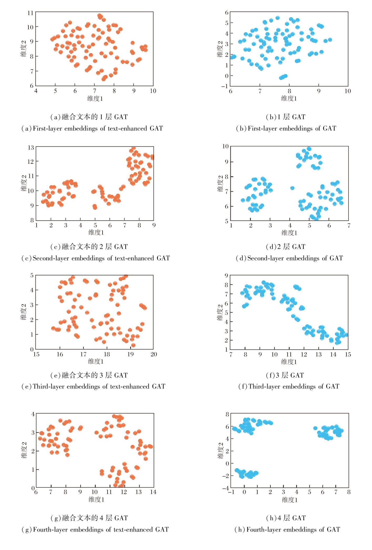 为了进一步验证TECAT中文本表示的有效性, 对不同GAT层数下的概念嵌入进行UMAP(Uniform Manifold Approximation and Projection)[31]可视化.在不引入文本表示和引入文本表示下的概念嵌入分布如图3所示.