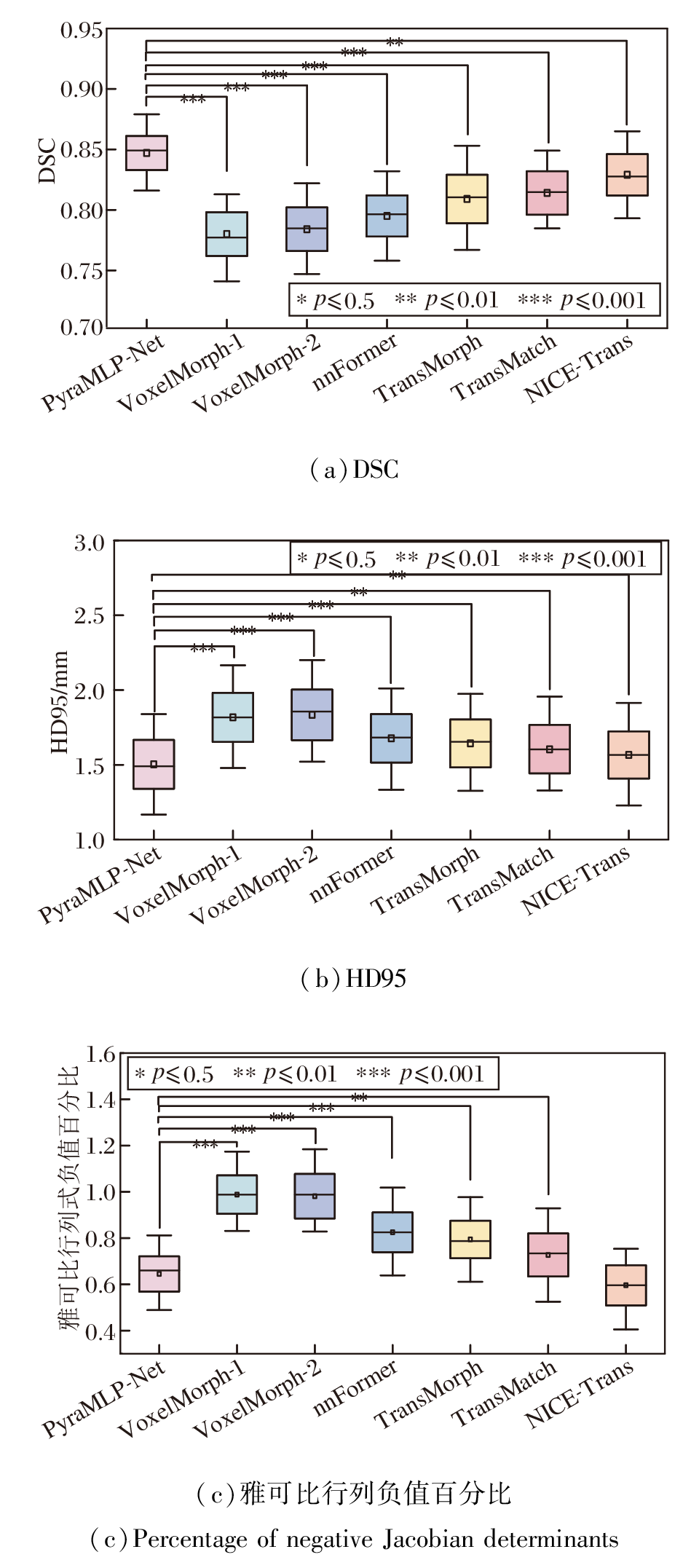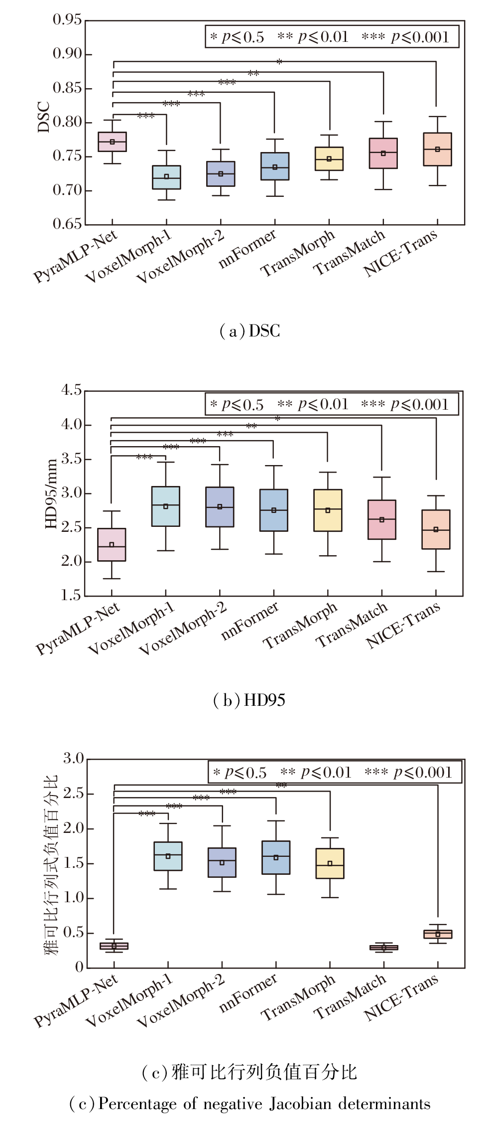 由图7可见, PyraMLP-Net在DSC和HD95上均处于最优区间(中位数分别为0.85和1.495 mm), 且四分位距最小(DSC中IQR=0.028, HD95中IQR=0.326 mm), 说明其在不同样本间具有高度一致的性能表现.在变形场平滑性方面, PyraMLP-Net的雅可比负值百分比中位数虽略高于NICE-Trans, 整体处于次优区间, 但IQR=0.152, 稳定性最优, 显示出该方法在精度与鲁棒性之间取得良好平衡.