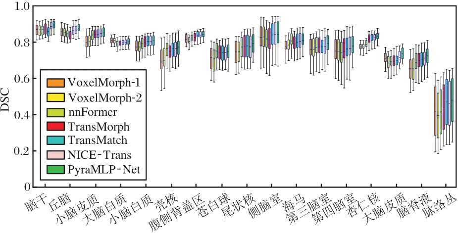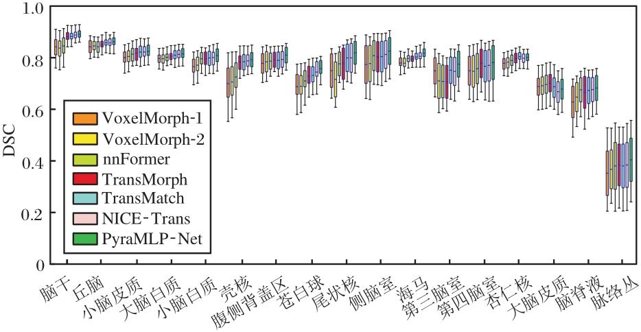 由表4可知, PyraMLP-Net在配准精度与结构一致性方面展现出显著优势, 相比VoxelMorph-1、VoxelMorph-2、nnFormer、TransMorph、TransMatch、NICE-Trans, DSC值分别提升约8.6%、8.0%、6.5%、4.7%、4.1%和2.2%, HD95值分别降低约17.3%、18.0%、10.4%、8.5%、6.4%和4.0%.在变形场平滑性方面, PyraMLP-Net的雅可比行列式负值百分比仅次于NICE-Trans, 但相比VoxelMorph-1、Voxel-Morph-2、nnFormer、TransMorph和TransMatch, 分别降低约34.7%、33.3%、21.8%、18.8%和11.3%, 体现出其优异的拓扑保持能力.