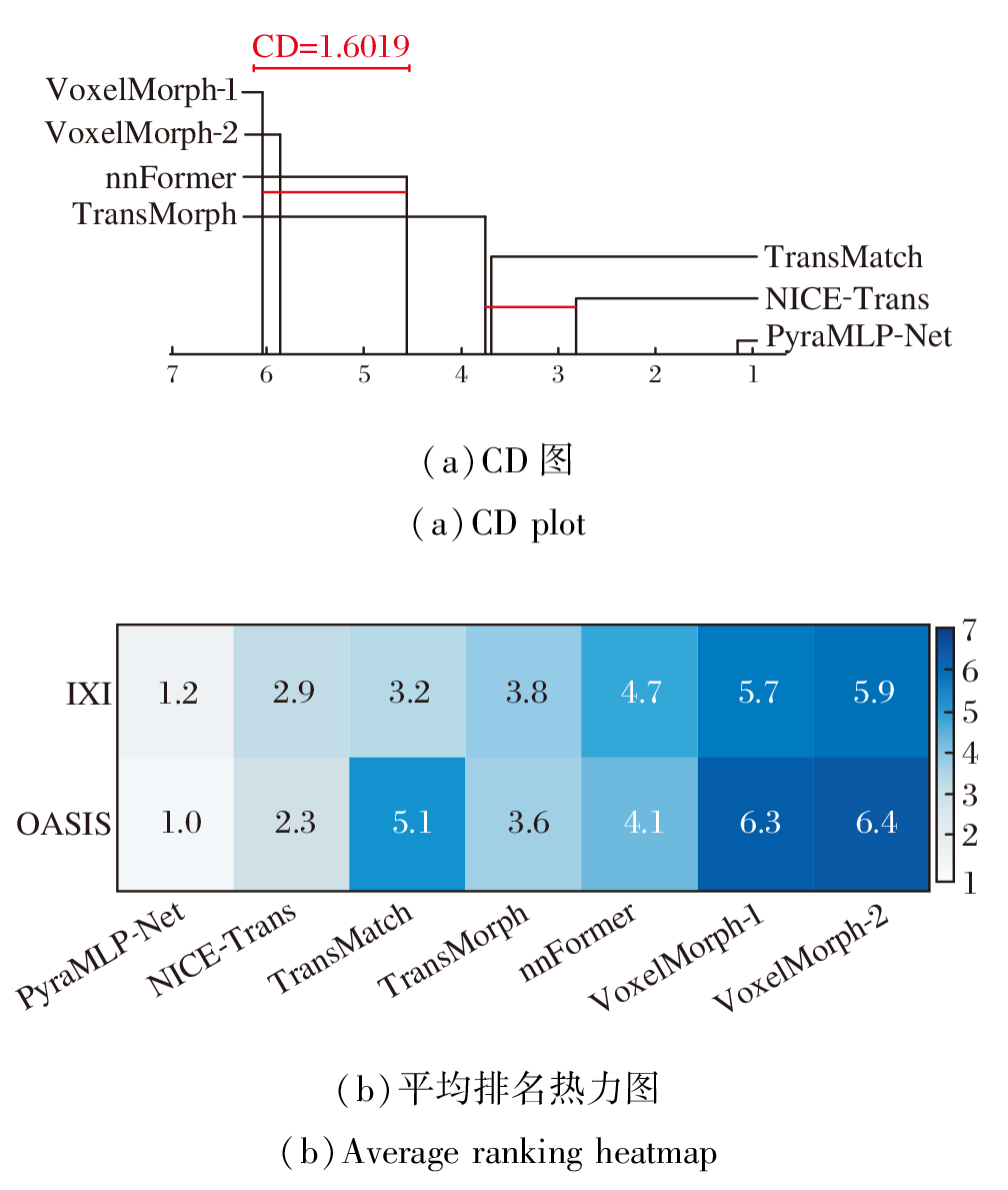 图10(a)的CD图显示, PyraMLP-Net在2个数据集上的DSC值平均排名均显著优于对比方法, 差异超过临界值.