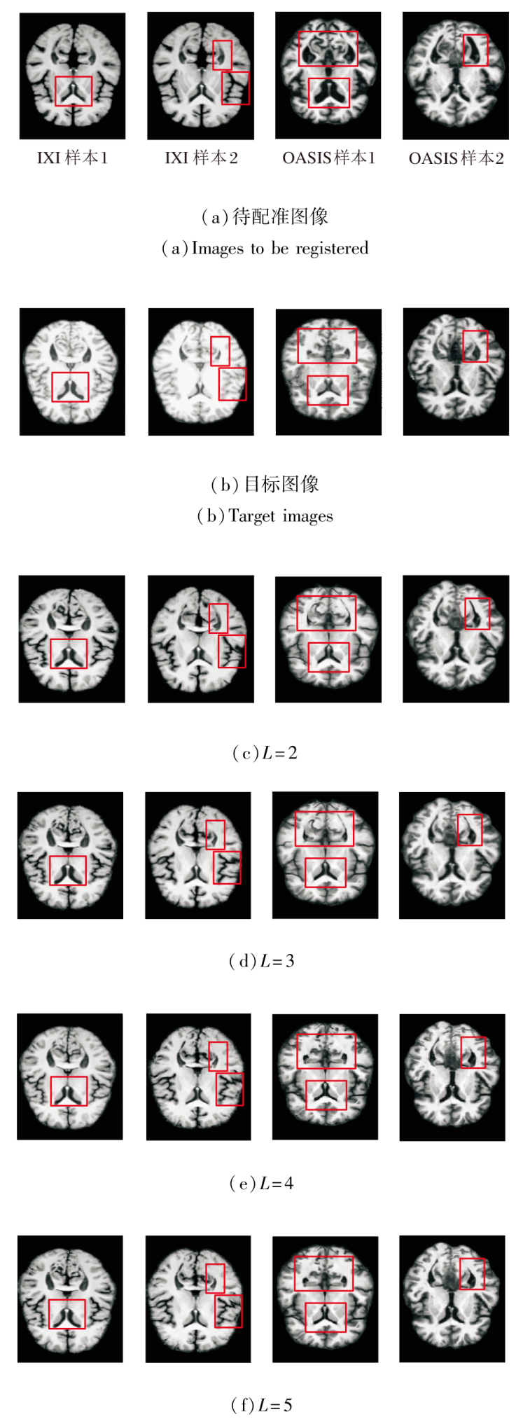 由图11、图12和表8可见, 当L=2时, 网络深度不足, 导致多尺度特征提取不充分, 对细微解剖结构的匹配能力有限, 配准精度最低.L=3时, PyraMLP-Net能捕获更多的中等尺度特征, 性能优于两层网络, 但仍难以建模高分辨率细节.L=4时, PyraMLP-Net实现从低分辨率到全分辨率的完整特征覆盖, 能更精准地匹配解剖结构, 各项指标值均显著优于浅层结构.当L=5时, 其性能与4层网络相比未出现明显提升, 但计算开销显著增加.以IXI数据集为例, 单次运行时间从0.355 s增至0.418 s, 内存占用从14.823 GB升至16.018 GB.这表明对于具有典型分布和结构规律的脑部MRI数据, 4层网络已能充分学习其特征表示, 继续增加层数不仅无法带来性能增益, 反而会引入冗余参数并降低计算效率.