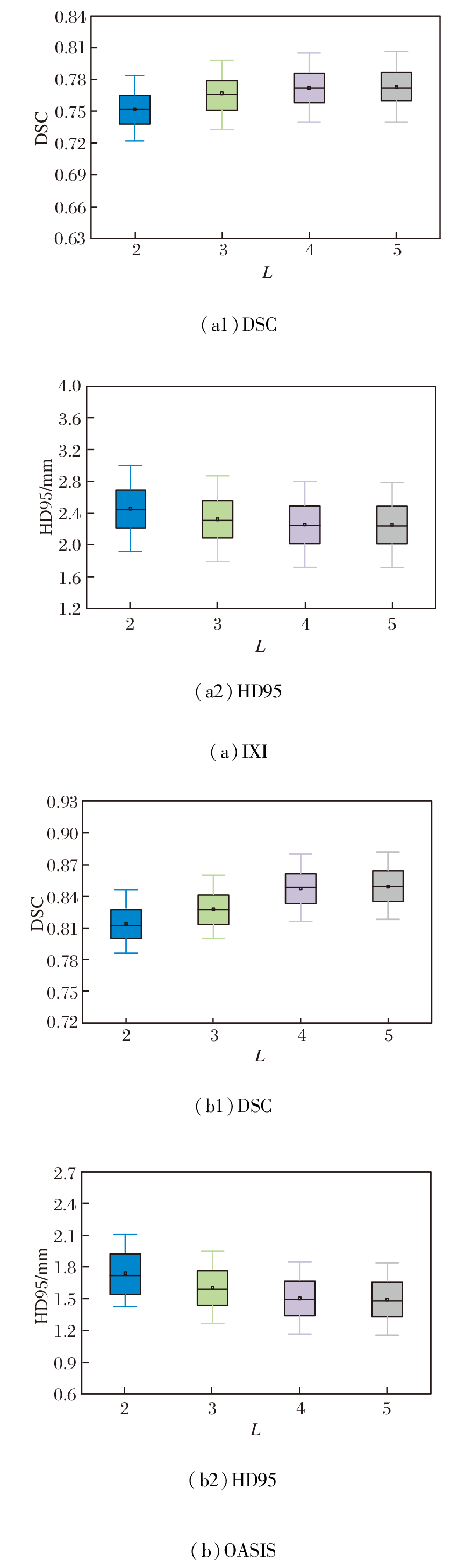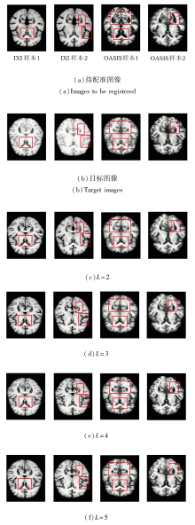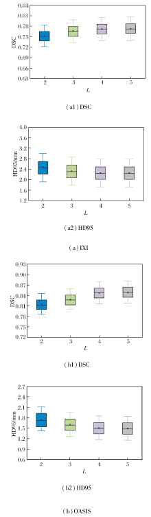 在IXI、OASIS数据集上各选取2个样本, 当网络层级数L改变时, 得到的图像配准结果如图11所示.L对PyraMLP-Net性能的影响如图12和表8所示.