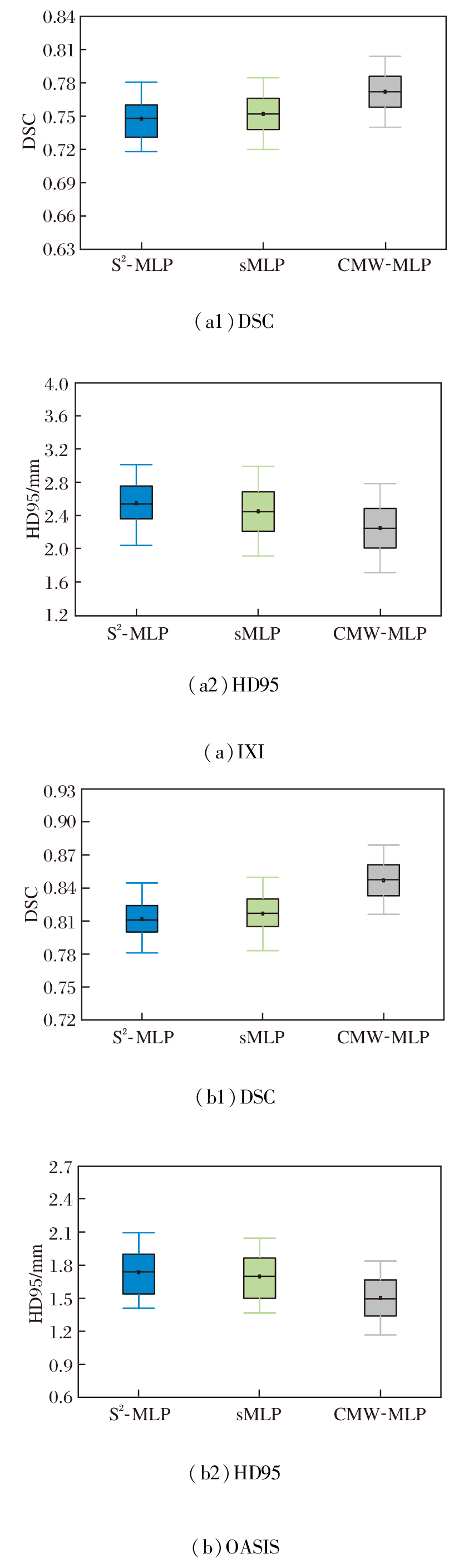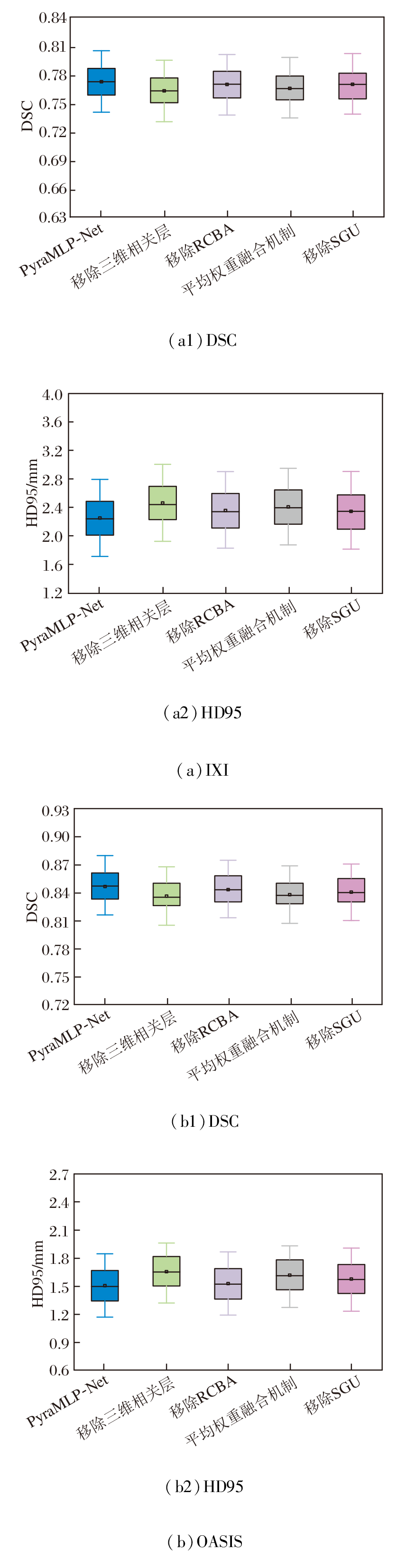 由于OASIS数据集包含轻度至中度阿尔茨海默病患者样本, 其脑部结构存在更复杂的萎缩形变与个体差异, 这进一步证实PyraMLP-Net在不同尺度与结构特征下的鲁棒性.