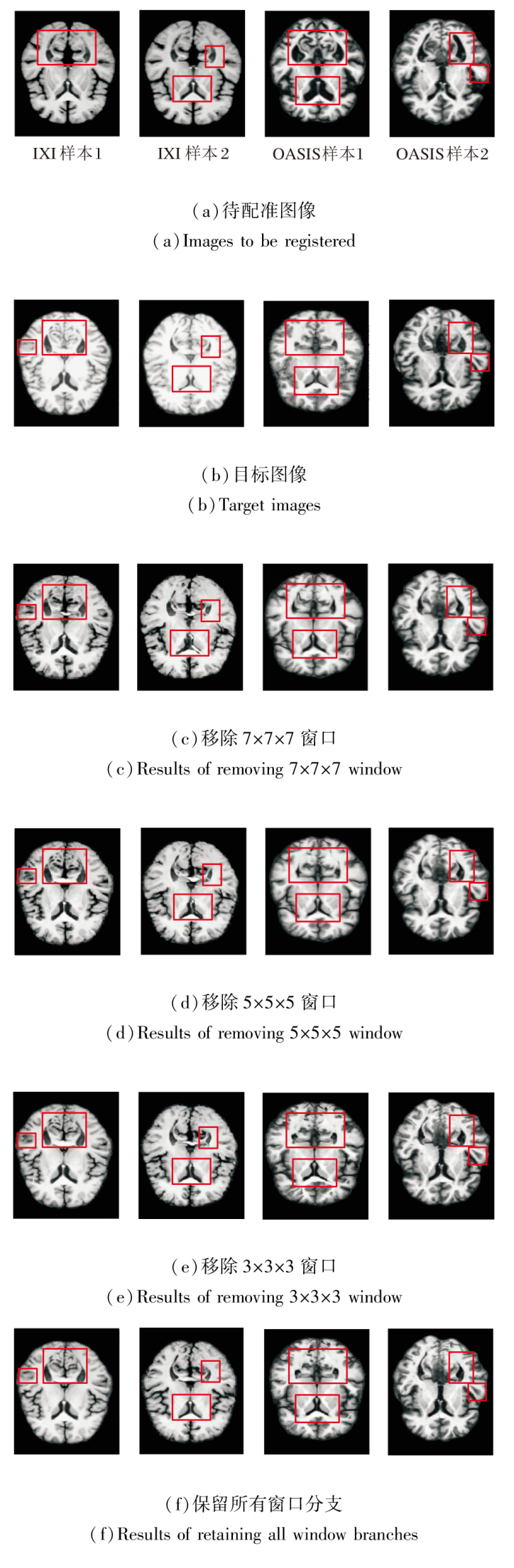 造成这一现象的原因在于不同尺寸窗口建模的变形尺度及其在脑图像中的分布存在差异.5× 5× 5窗口专注于捕捉中等范围的局部变形, 这类变形在脑部结构中占比最高, 对整体配准精度影响最显著, 因此移除该窗口导致的性能损失最大.