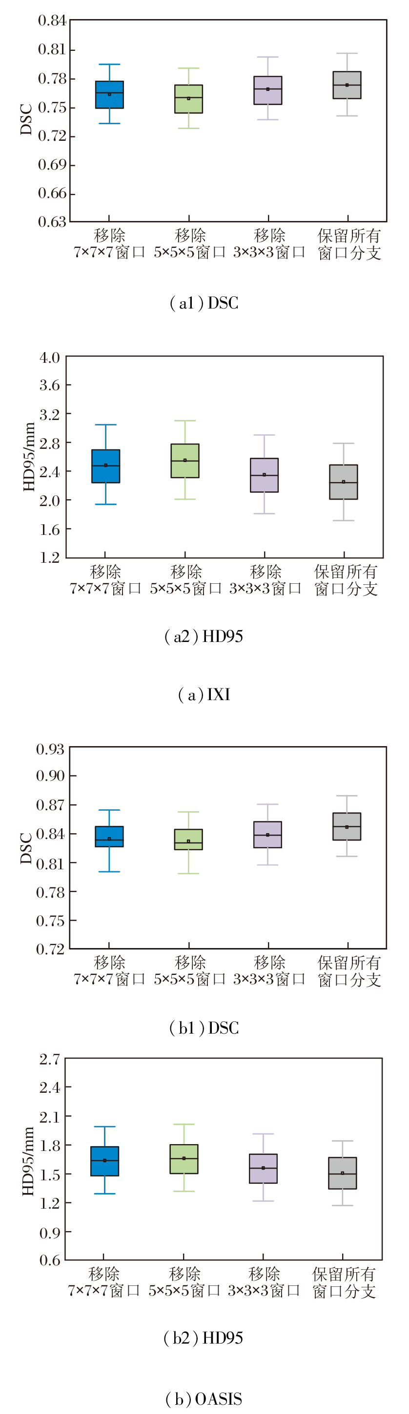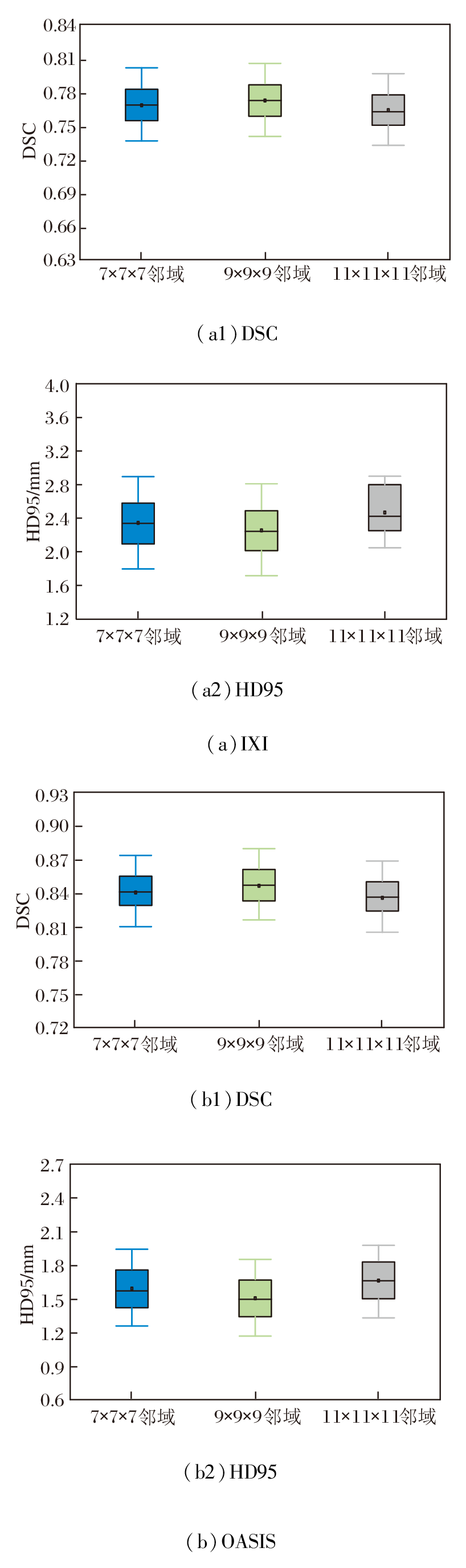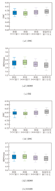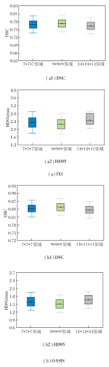 在OASIS数据集上, 相比7× 7× 7邻域和11× 11× 11邻域, 9× 9× 9邻域的DSC值分别提高约0.7%和1.3%, HD95值分别下降约5.4%和9.5%.