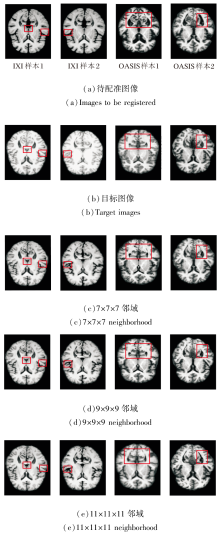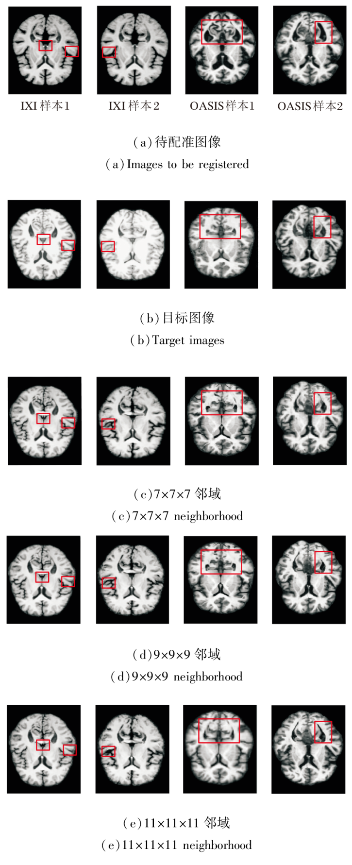 基于局部邻域内的像素强度统计相关性计算相似性损失函数, 邻域尺寸直接影响度量的鲁棒性.尺寸过小会导致局部采样不足, 难以捕捉完整的解剖强度分布, 降低对结构细节的敏感性; 尺寸过大容易引入无关区域的强度干扰, 模糊局部对应关系.为此, 本文设置7× 7× 7、9× 9× 9、11× 11× 11的邻域尺寸.