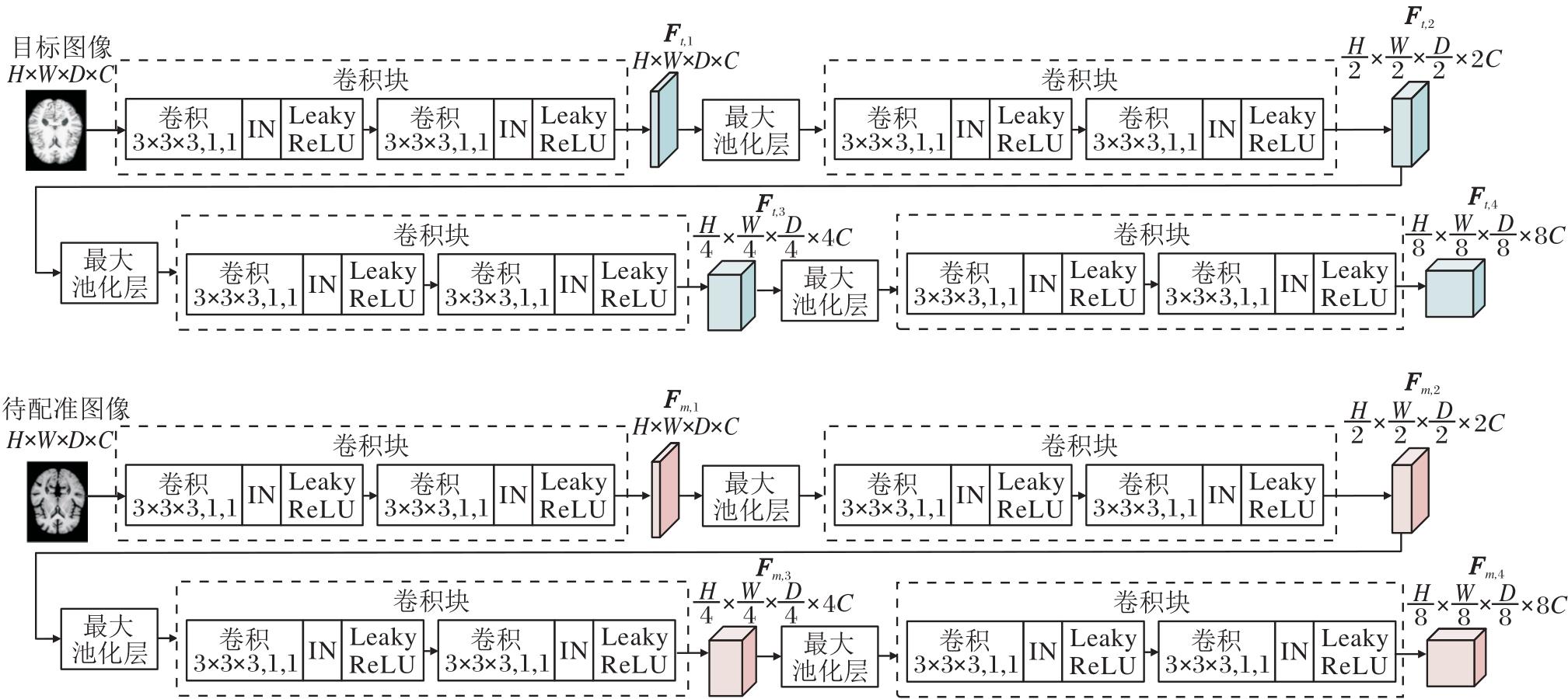 权重共享特征提取模块具体结构如图2所示.输入尺寸为H× W× D(高度× 宽度× 深度)、通道数为C的目标图像与待配准图像, 输出2组4级层次化的特征金字塔Ft={Ft, l}和Fm={Fm, l}, l=1, 2, 3, 4, 其中Ft, l和Fm, l分别表示第l层卷积模块输出的目标图像特征和待配准图像特征.每个子网络由4个连续卷积块和3个最大池化层构成.每个卷积块内含2个3× 3× 3卷积层(步长1, 填充same), 各卷积层后接参数为0.2的Leaky ReLU激活函数和实例归一化(Instance Normalization, IN).相邻卷积块之间通过2× 2× 2最大池化层(步长2, 填充same)进行下采样, 使特征图尺寸逐级减半而通道数逐级倍增.这种层级化设计通过逐步扩大感受野, 构建包含不同抽象程度的特征金字塔.其中:深层特征具有较大感受野, 能捕捉全局上下文与高层次语义信息; 浅层特征的感受野较小, 保留局部细节与空间结构信息.