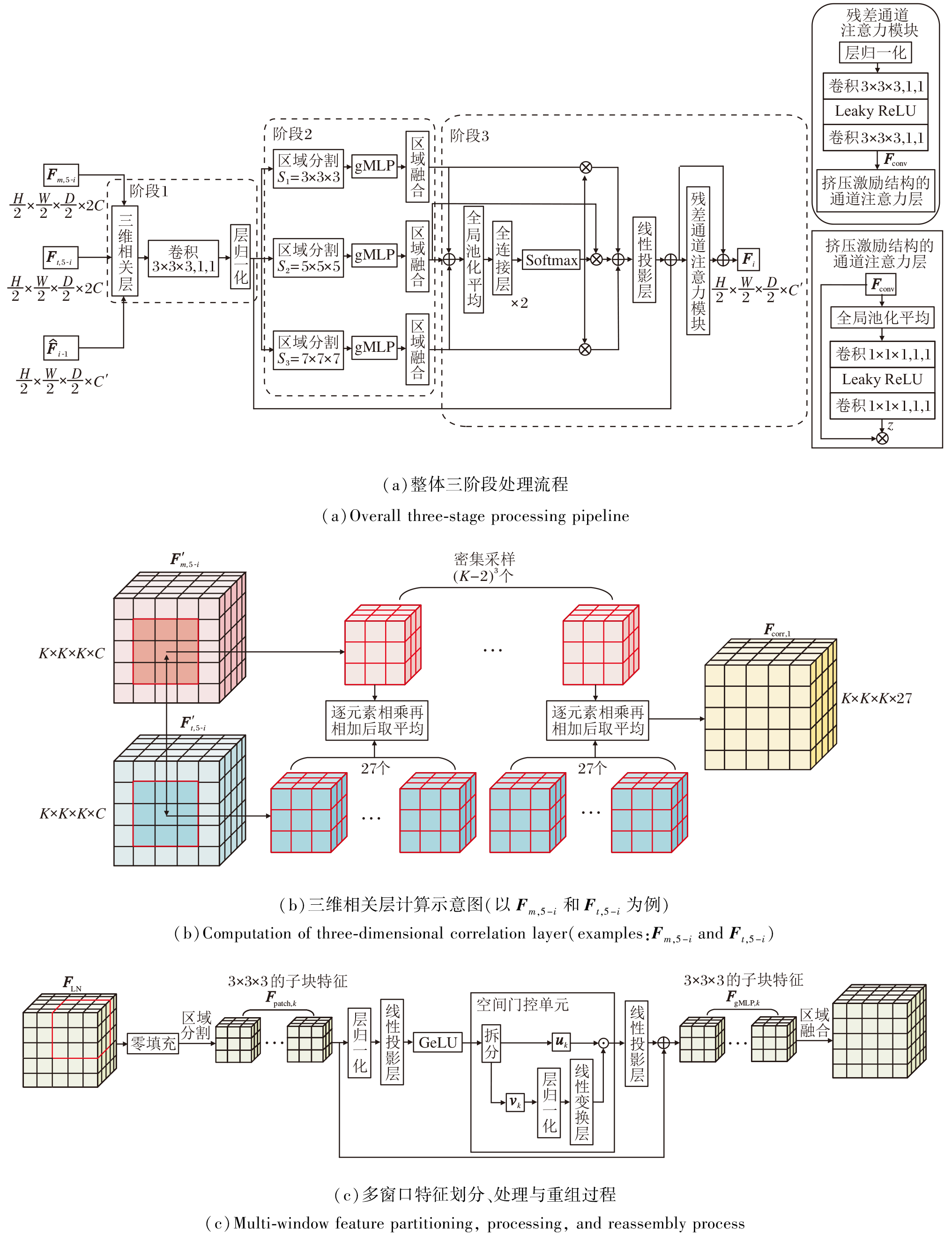 如图3(c)所示, 具体处理过程如下.首先, 对FLN执行零填充操作, 分别按照3× 3× 3、5× 5× 5和7× 7× 7的窗口尺寸对其进行非重叠划分, 生成对应的子块特征Fpatch, k(k=1, 2, 3).这种多窗口划分策略能同时捕获FLN的细粒度、中等尺度和大尺度的空间特征.