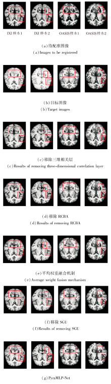 移除gMLP中的SGU对网络配准性能的影响处于中等程度.SGU作为gMLP的核心单元, 通过门控机制筛选关键空间特征, 强化窗口内像素的局部空间关联.移除后gMLP退化为普通MLP, 窗口内空间信息建模能力削弱, 但由于其作用仅局限于窗口内局部优化, 未触及配准核心逻辑, 故性能下降程度低于前两种操作.