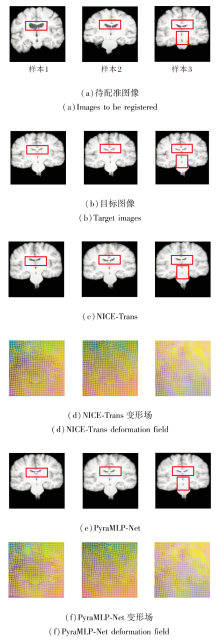 | 图21 NICE-Trans和PyraMLP-Net针对LPBA40数据集上3个样本的图像配准结果Fig.21 Image registration results generated by NICE-Trans and PyraMLP-Net for 3 samples from LPBA40 dataset |