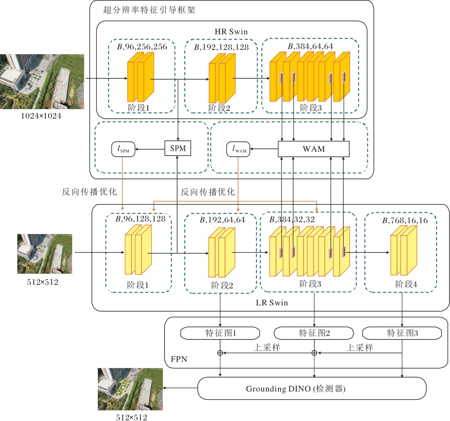 本文提出基于双重并行任务的无人机小目标两阶段检测方法(DB-TS), 结构如图1所示.DB-TS包括特征提取主干Swin Transformer、超分辨率特征引导框架(Super-Resolution Feature Guided Framework, SR)、颈部网络FPN及Grounding DINO[34]检测器.