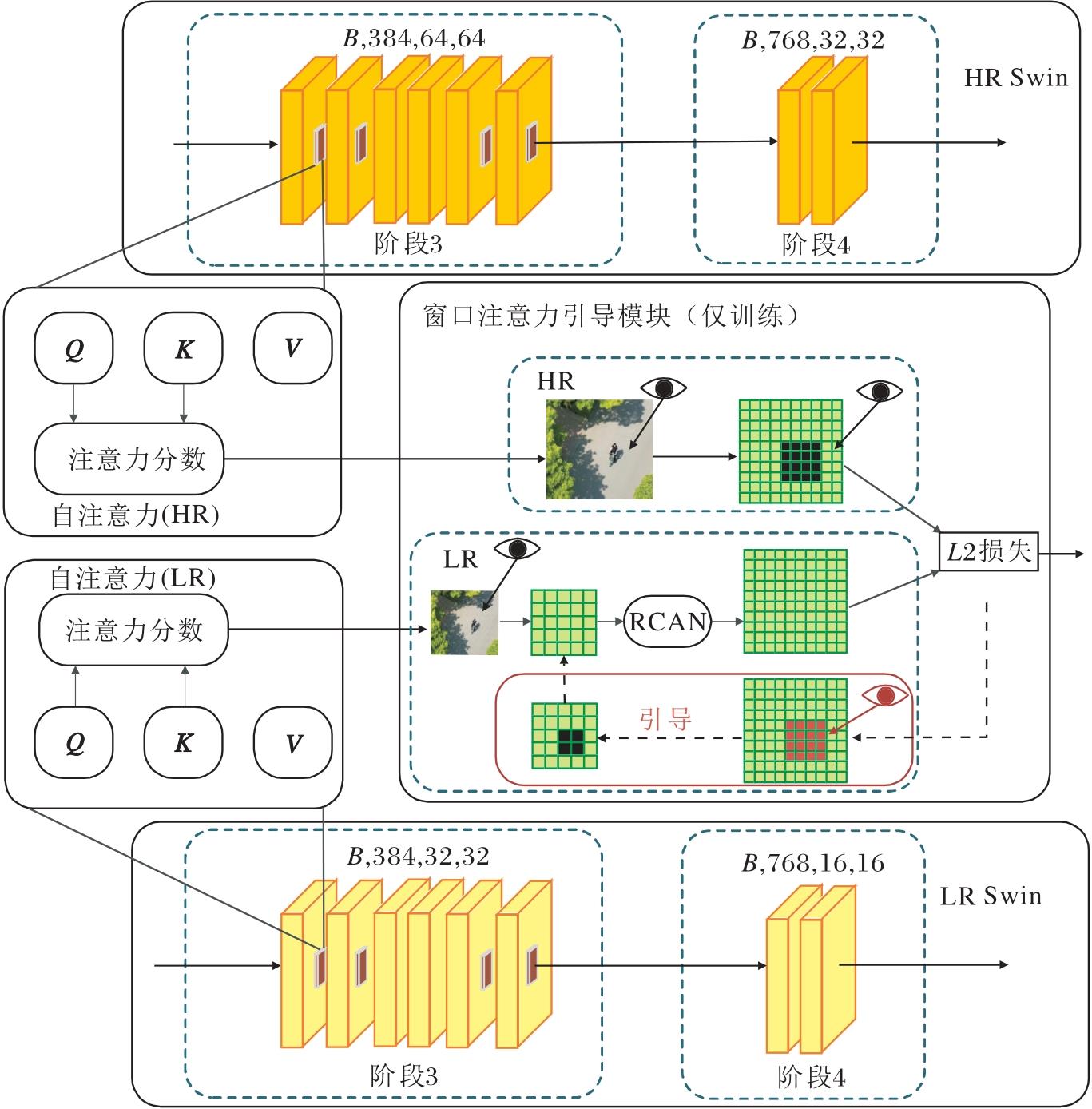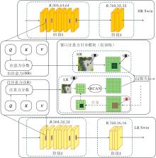 对于窗口注意力对齐损失lWAM, 首先获取LR Swin和HR Swin分支分别产生的注意力分数attnLR和attnHR, 再将LR Swin的注意力分数在7× 7窗口使用RCAN进行上采样, 此时RCAN内部的通道注意力压缩比为12, 低分辨率特征通过维度转化和高分辨率特征保持一致, 上采样后的注意力分数为: