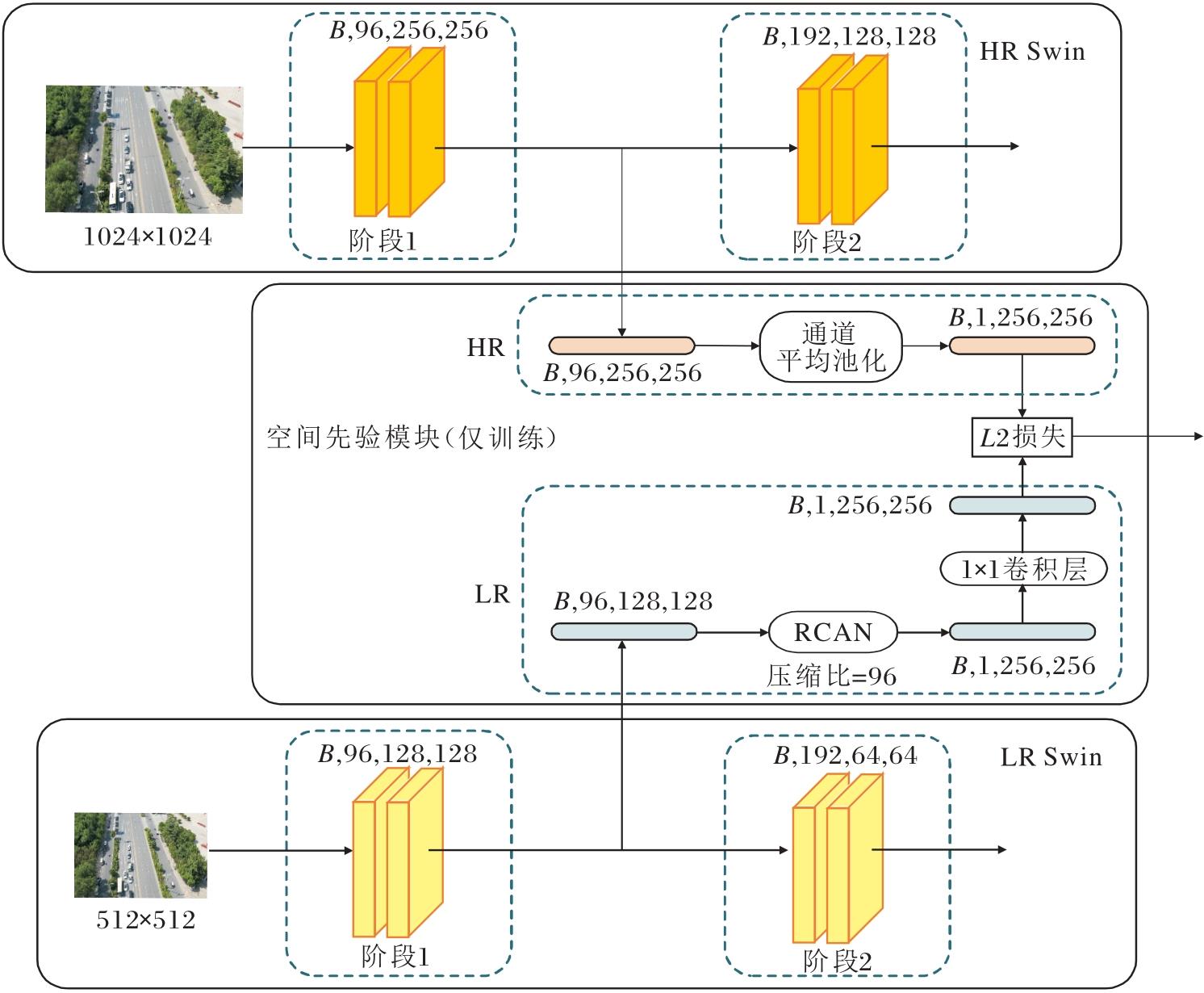 其中, RCANrd=96(· )表示上采样操作, Conv1× 1(· )表示1× 1卷积.然后把两种特征图送入L2损失函数, 使高分辨率特征图在训练时从空间上为LR Swin提供先验信息并抑制背景噪声的影响, 引导LR Swin的输出在空间布局上与高分辨率特征相似, 这样不仅加快收敛速度, 而且进一步提升检测精度.