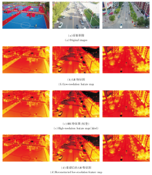 为了分析DB-TS内部特征, 在VisDrone数据集上进行可视化实验.由于WAM的特征上采样为分辨率极低的高维图像, 可视化结果更难以理解, 因此, 选择SPM中处理的浅层特征图, 对通道维度进行平均池化后再执行可视化, 具体如图6所示.从图可看出, LR特征图通过超分辨率方法进行重建后, 图像细节几乎能和HR特征图保持一致, 由此说明特征级重建指导是容易实现且有效的.