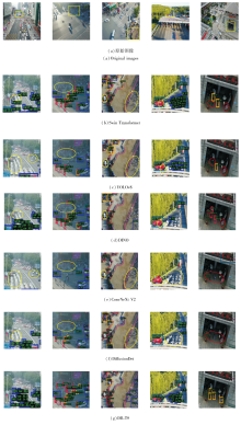 为了进一步说明DB-TS的有效性, 在VisDrone、JZ-UAV数据集上进行可视化分析, 使用如下对比方法:Swin Transformer[9]、YOLOv8[33]、ConvNext V2[36]、DINO[40]、Diffusiondet[42].具体可视化结果如图7和图8所示.各方法可视化原始图像中黄色方框区域内的手动放大图像, 椭圆框内是DB-TS识别出而其它方法并未识别出的目标.