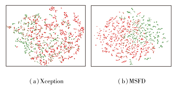 最后, 为了更直观地展示MSFD在CDFv1数据集上的判别能力与泛化表现, 对网络最后一层输出的高维特征向量进行降维, 并采用t-SNE(t-Distri-buted Stochastic Neighbor Embedding)进行可视化, 结果如图3所示, 图中红点表示伪造样本, 绿点表示真实样本.由图可观察到, 相比Xception, MSFD在特征空间中的类内聚合性更强, 类间区分更明显, 同时错误簇中的异常点也更少.这进一步表明所学特征不仅具备良好的区分能力, 还展现出较强的跨数据集泛化性.