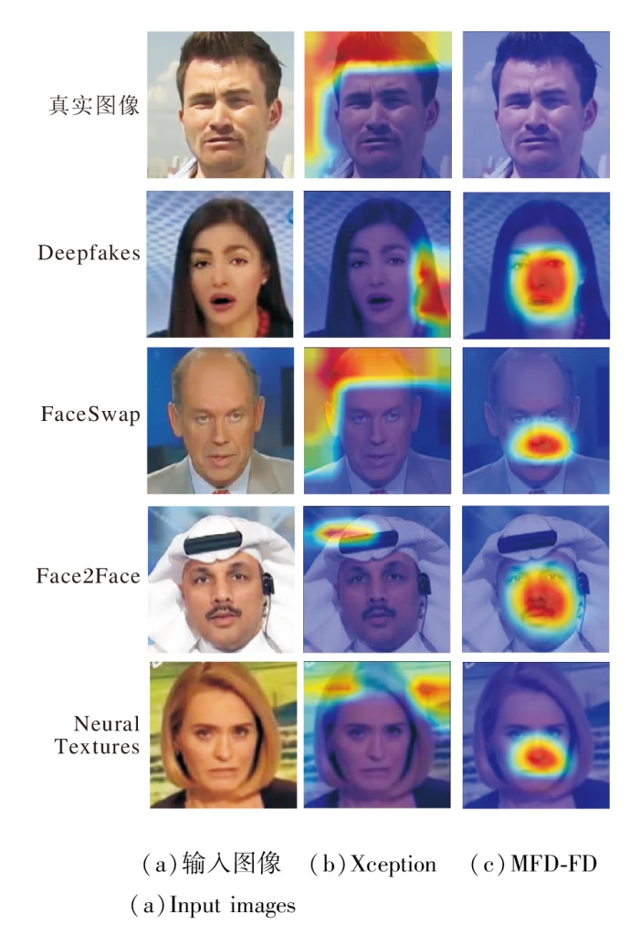 为了直观验证MFD-FD的有效性, 在 FF++ 数据集上, 对Xception与MFD-FD分别应用Grad-CAM(Gradient-Weighted Class Activation Mapping)[46]进行可视化, 结果如图5所示.由图可见, Xception常过度拟合局部小区域或关注与伪造无关的内容特征(如背景), 激活分布较分散.相比之下, MFD-FD注意力更集中, 主要聚焦于人脸区域而非背景.这一差异源于本文提出的解耦框架, 该框架能有效消除内容特征的干扰, 引导检测器挖掘判别性的伪影特征.反之, 在仅依靠标签且无额外约束的情况下, 检测器难以定位判别性伪影, 容易产生内容偏差, 导致过拟合甚至误导优化方向.