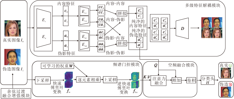 综上所示, 当前伪造图像检测研究仍存在若干不足.首先, 现有特征提取过程存在语义内容与伪影特征耦合, 导致判别器容易受到图像语义变化影响而降低泛化能力.尽管已有方法尝试将伪影特征与内容特征解耦, 但大多为单阶段分离, 分离后的两类特征仍保留部分耦合.其次, 多数方法仅依赖RGB空间的表征, 难以充分捕获伪造图像在频谱域中微弱且分散的痕迹, 这种单一模态的表征方式不仅限制模型提取伪影特征的能力, 也导致其在面对图像压缩、噪声干扰时鲁棒性不足.最后, 训练样本通常缺乏足够多样且含判别信息的伪造样本, 使模型在遇到新的伪造方法或合成分布时性能下降.