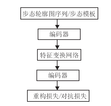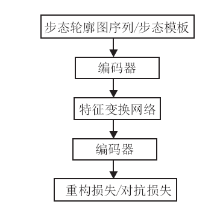 步态识别的生成式方法将某种状态下输入的步态特征变换到另一种状态下再进行匹配或特征抽取.以跨视角场景下的步态识别为例, 生成式方法首先将各种不同视角下的步态特征通过编码器进行编码, 然后通过一个特征变换网络将编码后的特征变换到一个典型视角或某个验证集视角, 最后通过解码器对变换后的特征进行重构.图3为生成式方法的训练架构图.